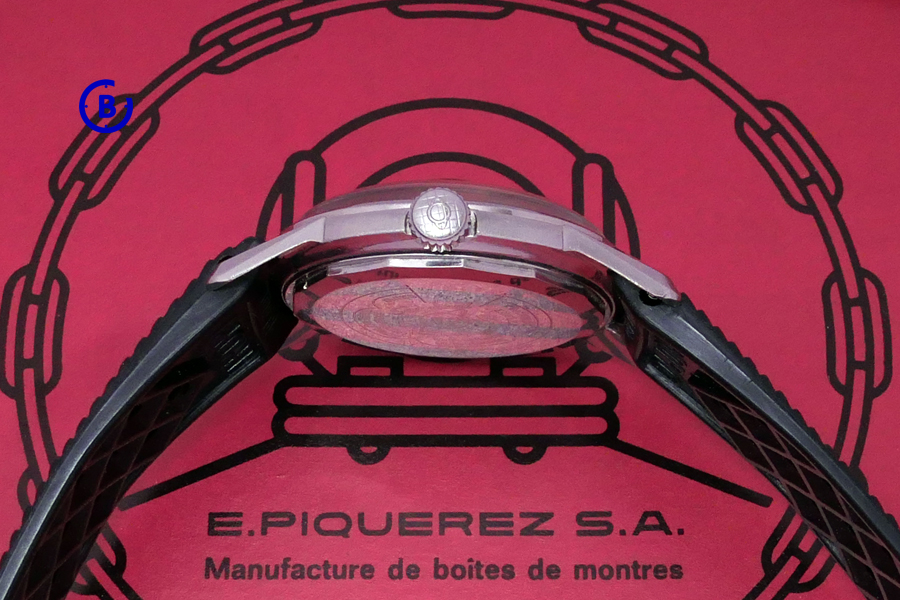 On the inside of the case back we find the biggest difference; the case back is not a traditional screw down case back, but equipped with a bayonet locking system. Here we also see the divers helmet and the E.P.S.A. markings. 4-58 indicating that this watch is from 1958.