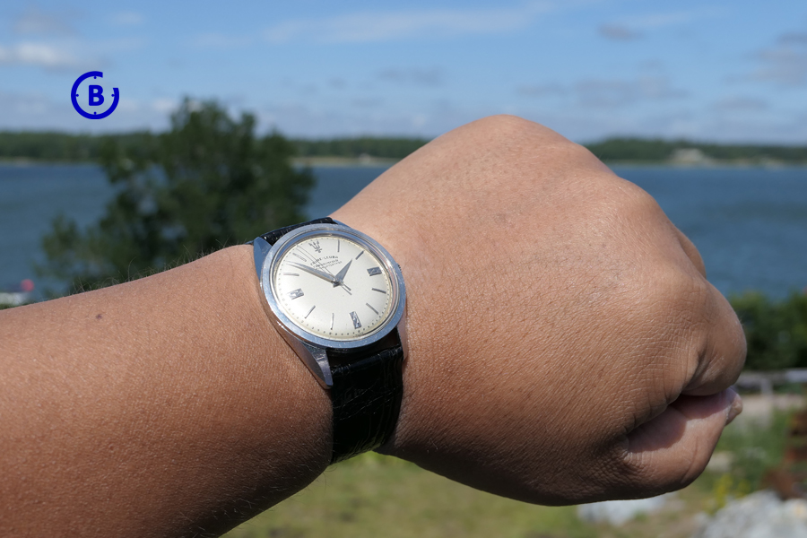 Classic elegant with some interesting details: the dial – on the dial is not the usual hour glass logo but a trident logo. I have not been able to identify when or why this logo was in use, but if you search the net there are several Favre-Leuba watches with this logo, based on the looks from the late 1950’s.