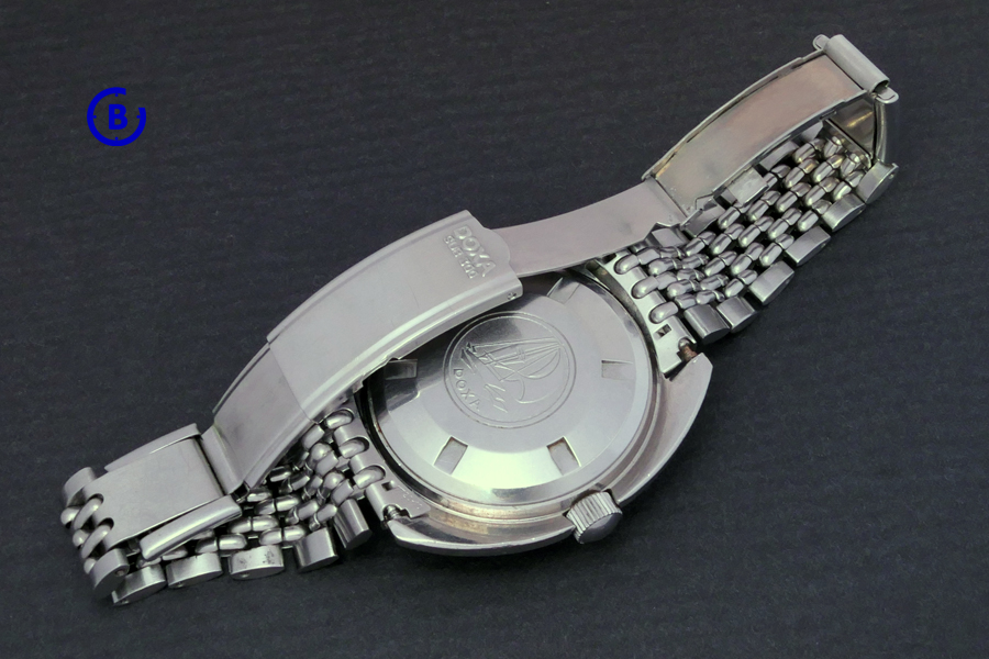 From the back there is not much that differs. On the case back is the DOXA sailing boat, no mentioning of Synchron this early in time. The bracelet with the double folding clasp is the early version with a pusher on the side to adjust the expandable part.