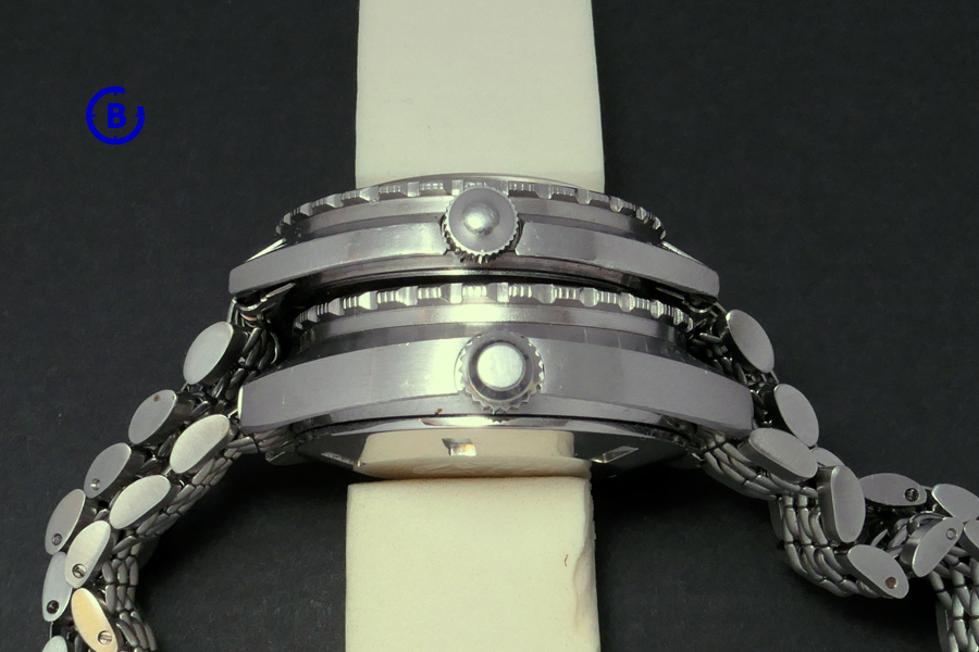The SUB 300 no T, reference 11889-4 case is only 10mm thick (not including the domed plexi crystal), while the SUB 300T, reference 11899-4 case is 14mm thick! Four millimeters might not sound as a lot, but yes it is.