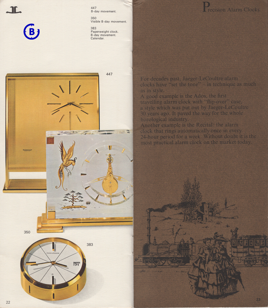 Here shown in the 1966 Jaeger-LeCoultre catalogue featuring the clock 383, one of them – there were several different catalogue versions that year.