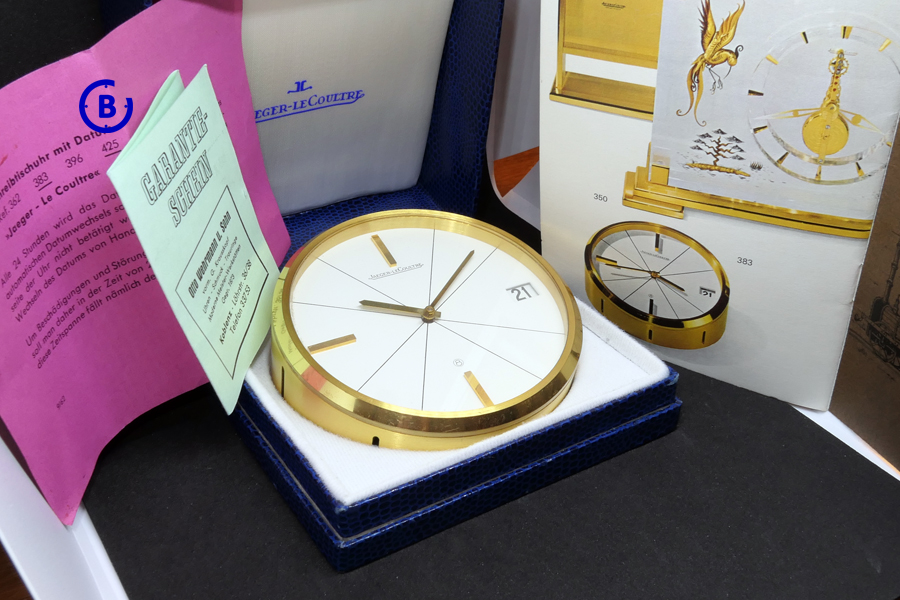 OK, let’s have a look inside the box. Here we find the Jaeger-LeCoultre reference 383 Clock, 95.5 mm in diameter – sold in October 18th 1963.