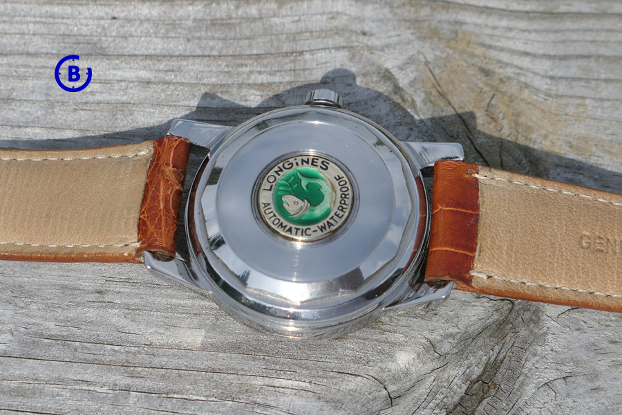 Inside is the Calibre AS 19, protected by a screw down case back decorated with a golden Longines medallion. Some of the green enamel still present.