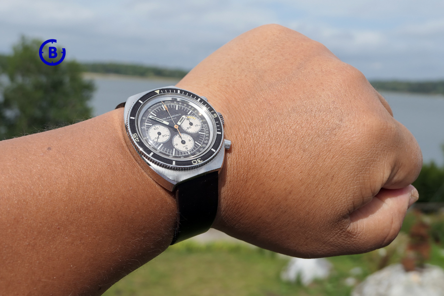 The base for this watch is the same as for the more well-known reference 9075, only difference are the colour scheme and the case shape.