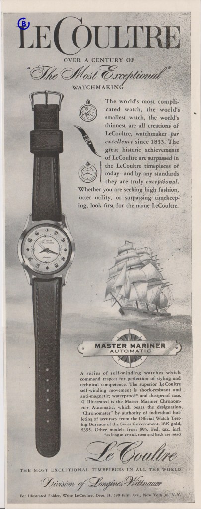 Here is an LeCoultre Master Mariner ad from 1957, the year before the 125 years anniversary. Notice the text ‘Over a century of “The Most Exceptional” watchmaking’.