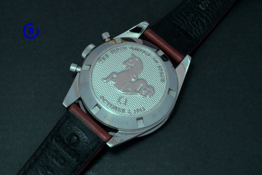 Modern with a vintage feel – inside is the manual movement, Calibre 1861. Not on display, closed case back with the “THE FIRST WATCH ON THE MOON – OCTOBER 3, 1962” and the classic Omega Seahorse.