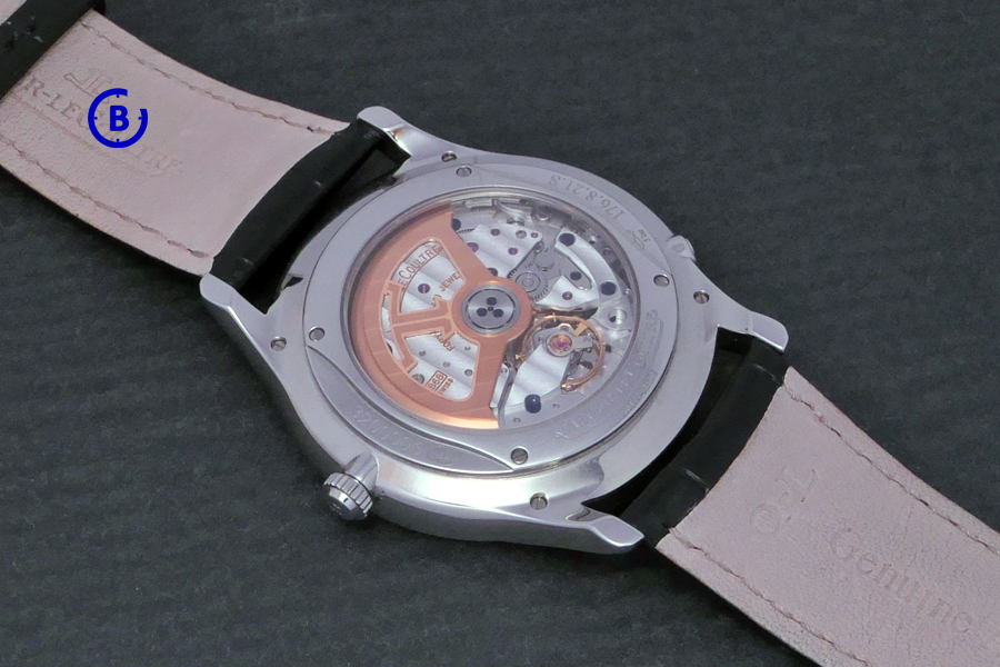 Through the open case back you see the Jaeger-LeCoultre Calibre 868/1. The flatt Calibre (4.72 mm) allows the thin profile.