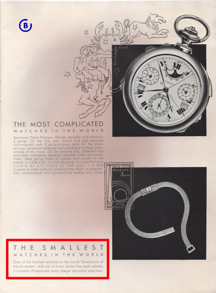 Here are the watches presented in the 1939 New York World Fair catalogue, quite similar offerings. One interesting detail is that the name on the dials is Jaeger-LeCoultre and not LeCoultre.