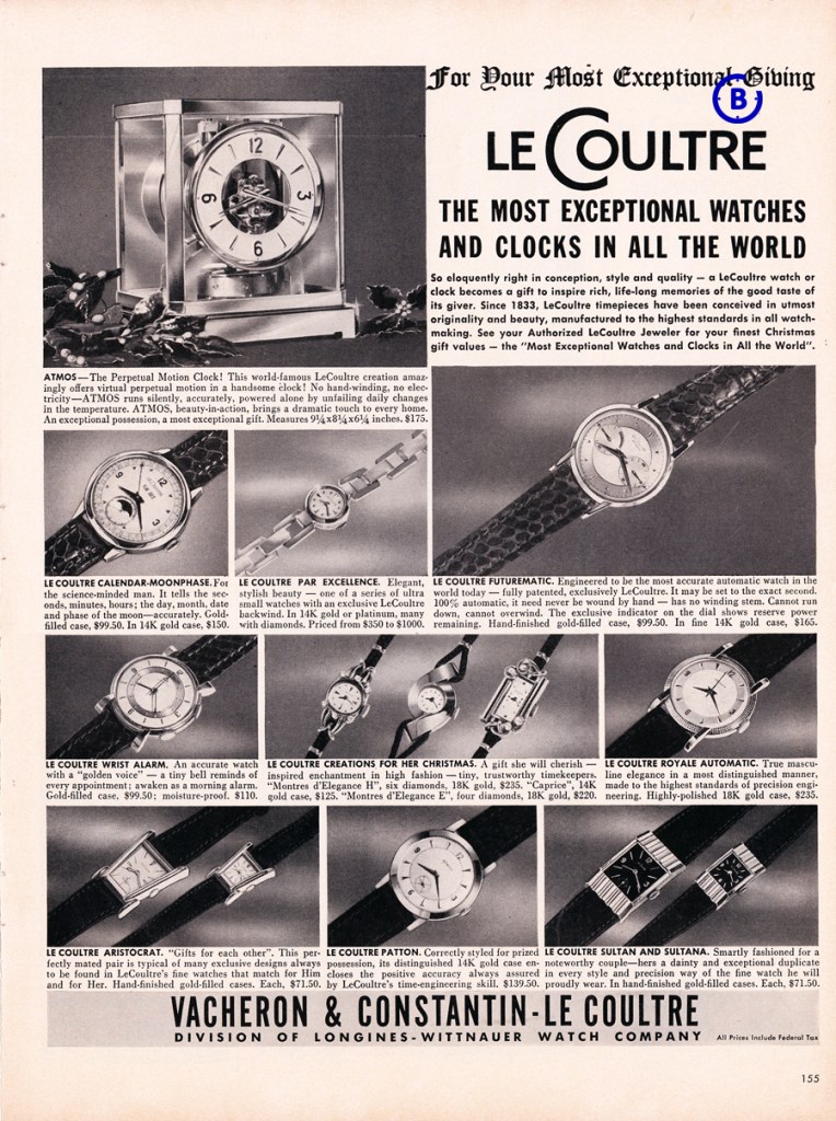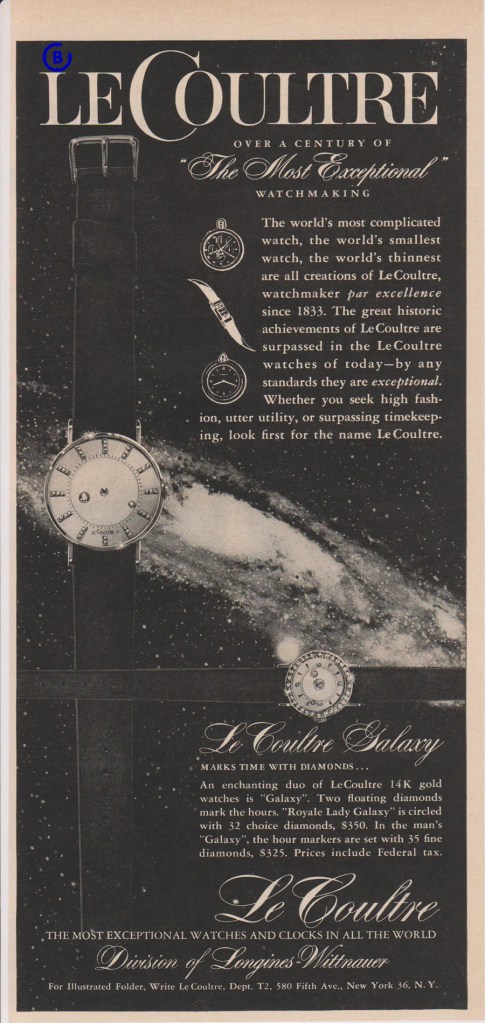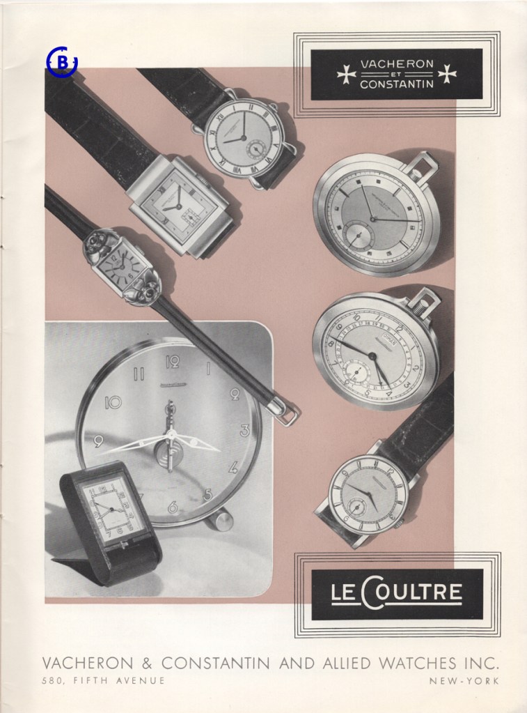 Next document I like to show is an LeCoultre ad from 1948, showing Vacheron & Constantin-LeCoultre, division of Longines-Wittnauer watch company.