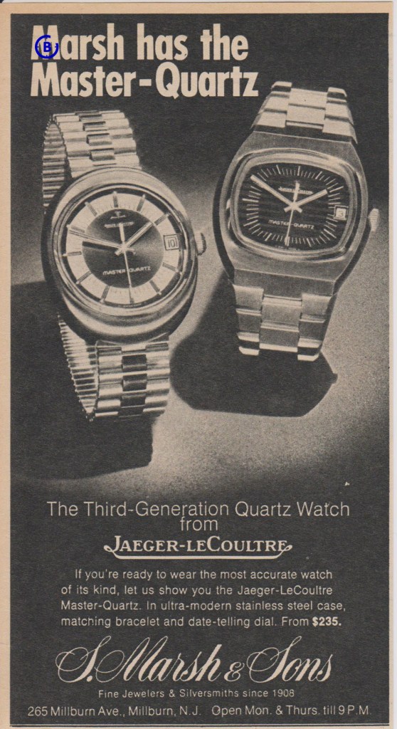 Last example is not an official Jaeger-LeCoultre ad, it is by a retailer, S. March & Sons, but it do reflect the change that had happen during the first part of the 1970’s, Jaeger-LeCoultre is the name used both in the ad and on the dial.