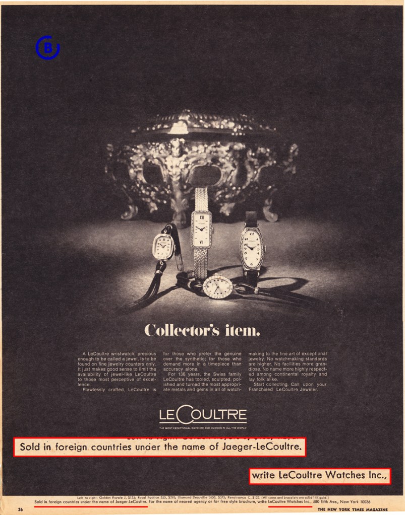 A more correct description might have been: “Jaeger-LeCoultre, sold in the U.S. under the name LeCoultre“…