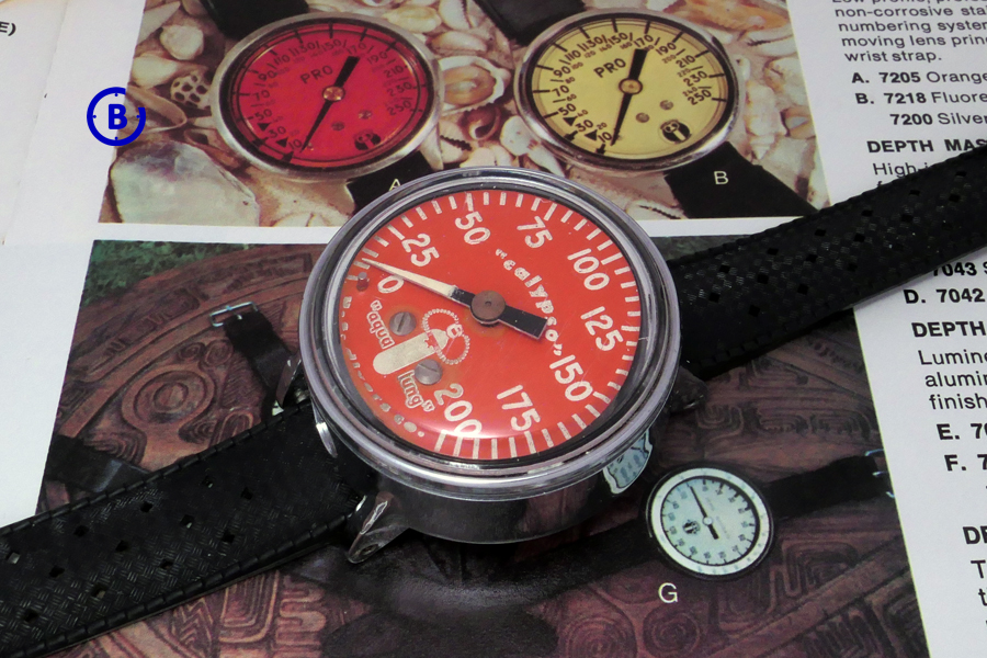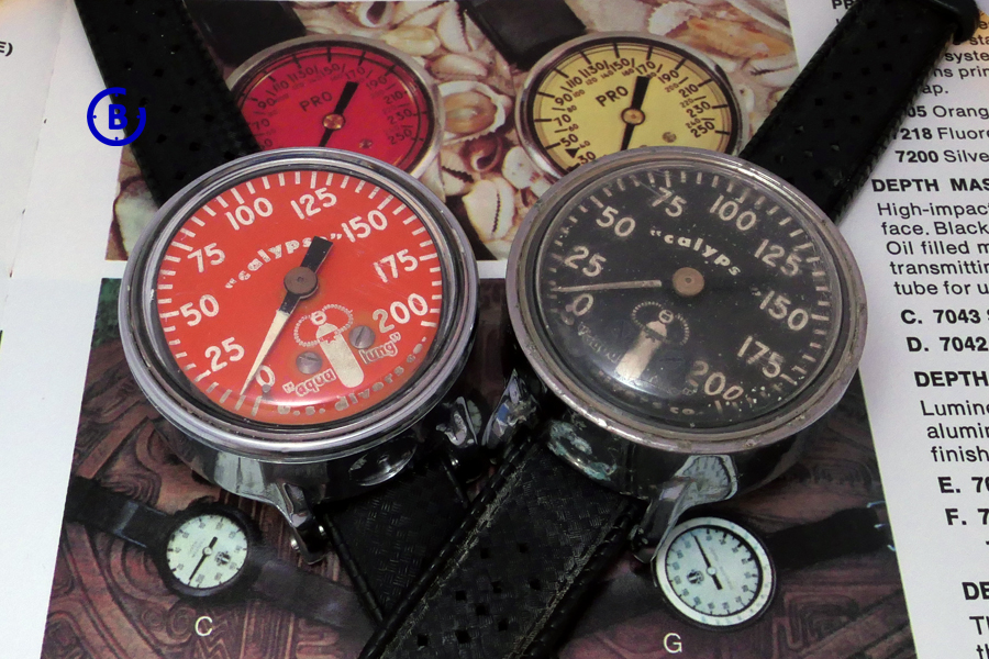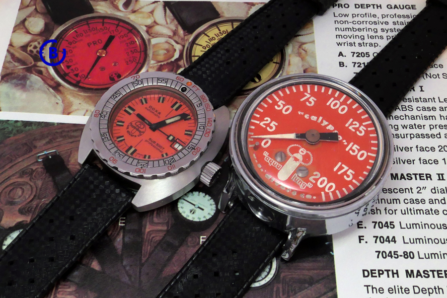Here the match is better – T.W.O orange “aqua-ling” dials: the DOXA SUB 300T “aqua-lung” Professional and the U.S. Divers Co. “Calypso aqua-lung” depth gauge: