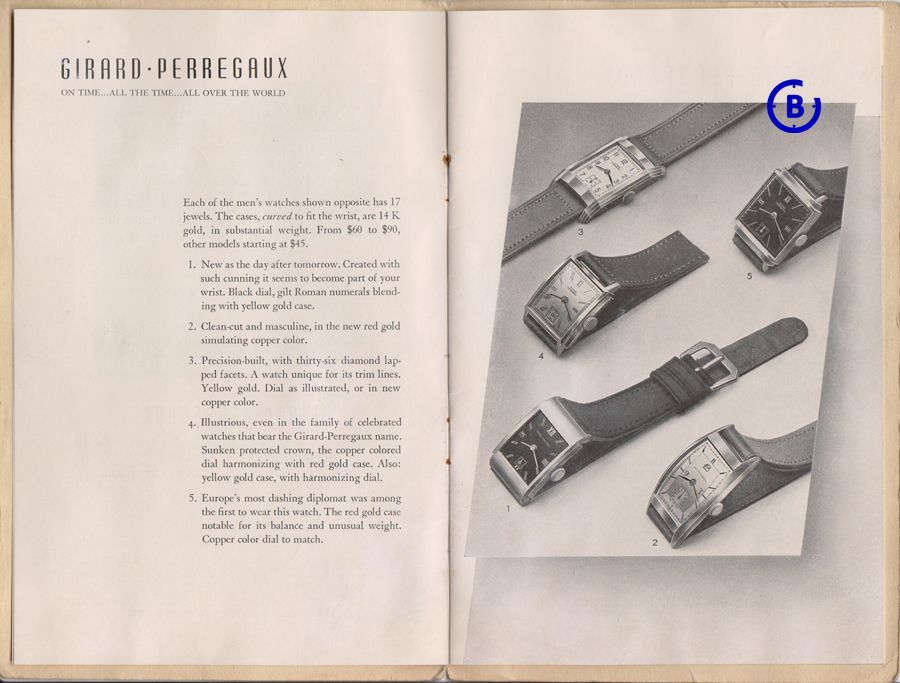 Here is a scan from the 1940 Girard-Perregaux catalogue featuring several rectangular Art Deco designed watches… Yes, the original “Vintage 94” and “Vintage 1945” were just T.W.O of many back then!