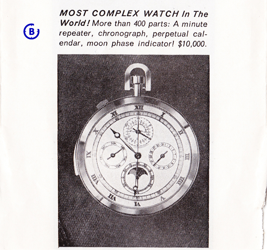 If you add the information from each ad you get the following information: Minute Repeater, Perpetual Calendar, Moon Phase, Split Second Chronograph, 400 parts!