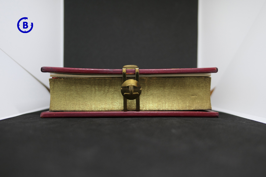 The Geophysic book is made out of burgundy red leather with gold prints on both sides and on the back.