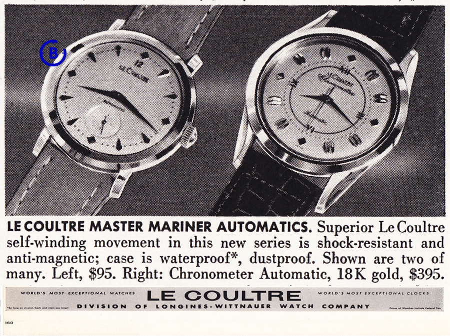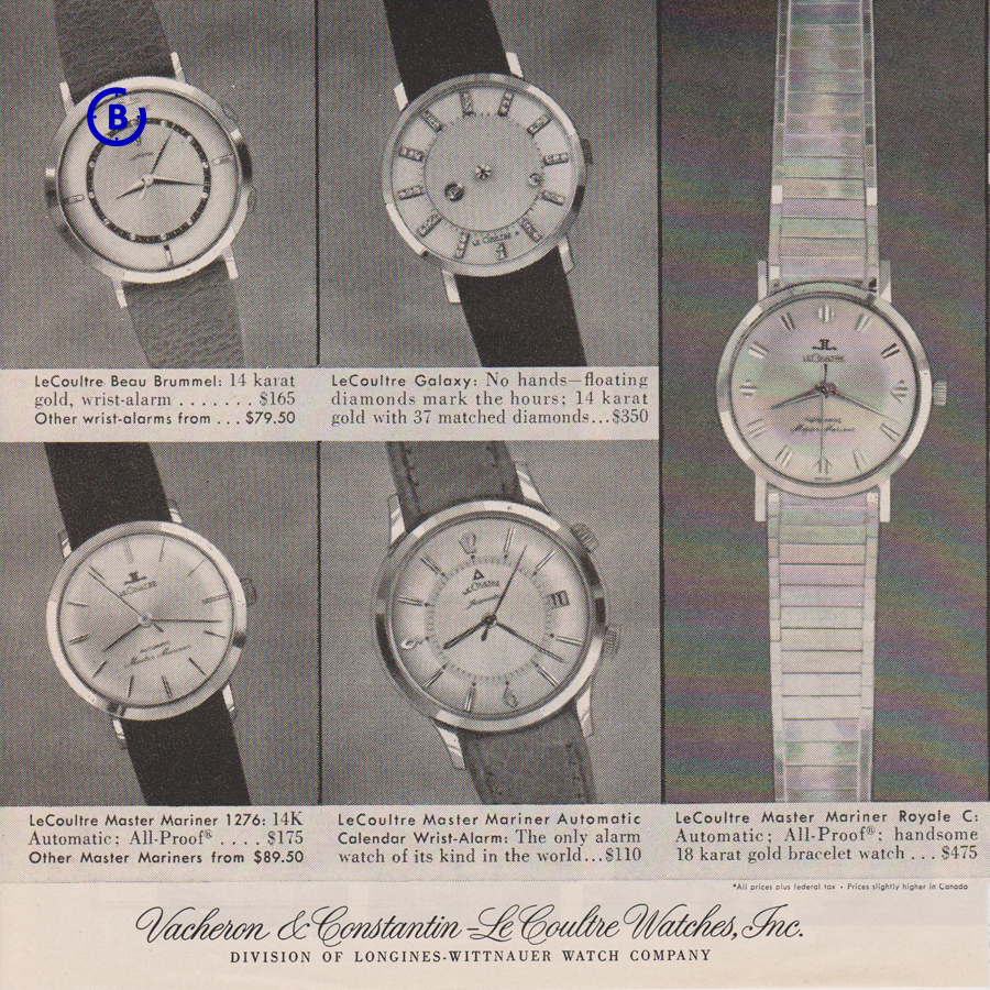Another LeCoultre example from the same year, 1963 – only one Master Mariner watch in this ad, but it tells us that the Master Mariner Royal were made in both 18K and 14K solid gold.