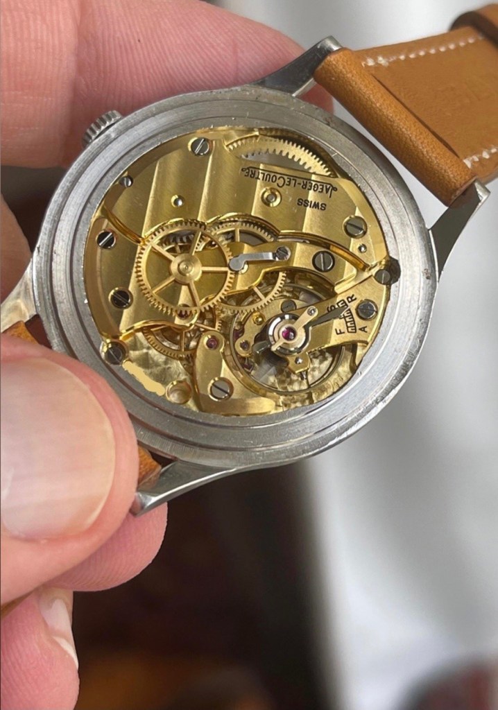 The movement is a calibre P450/4C, which interestingly can be found in both military watches from the 1940s, as well as dress watches from well into the 1950s. The calibre (and later modified versions of it) would be used frequently in three-hand JLCs during this period. It possesses a 40 hour power reserve and operates at a rate of 18,000 vbh.