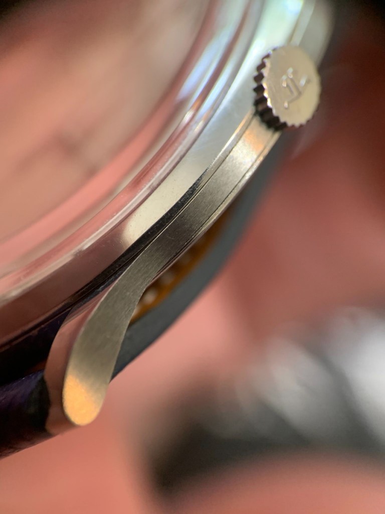 The case measures in at 36mm (44mm lug-to-lug) and certainly fits into the “jumbo” territory. At a very elegant thickness of 9mm (including the domed caseback and crystal), it is most certainly a dress watch that at best can be made a bit more casual with the likes of a tan or brown strap. The bezel is very minimal in size, and does not enhance the watch in any physical sense. It is one of those timepieces that could be described as “all dial”. The steel crown, a signed one branded “JL”, is more than likely from a later date which had been added on subsequently. Both the bezel and lugs’ surfaces are polished to a mirror finish, met with a crisp edge, and ultimately accented with a horizontally brushed profile.