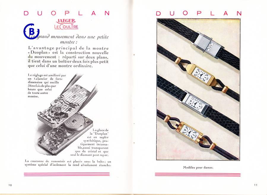 Here is an early 1930’s Jaeger-LeCoultre catalogue featuring the same Duoplan model as in the advertisement above, top right: